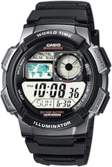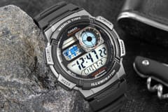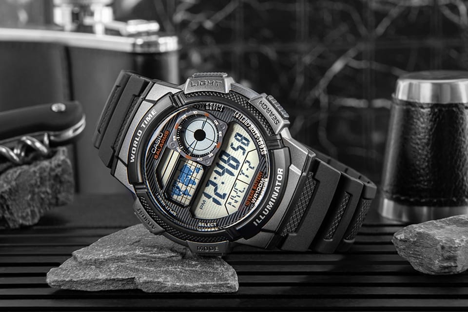 Model CASIO z Multi Time, światowym czasem, stoperem, alarmem x 5 i minutnikiem - a to wszystko 10 lat na jednej baterii. Casio AE-1000W to zegarek, który nadąża za Tobą - tarcza inspirowana kokpitem samolotu nadaje mu surowy, techniczny charakter, który podkreśla męski styl i dynamiczny tryb życia. Dzięki mapie świata i funkcji World Time możesz jednym rzutem oka sprawdzić czas w różnych strefach, co sprawia, że to idealny wybór dla podróżników i profesjonalistów pracujących na międzynarodową skalę. Wyświetlacz LC Analog sprawia, że zawsze masz pod ręką godzinę swojego miasta domowego, a wodoodporność do 100 metrów pozwala na swobodne użytkowanie zegarka w trudniejszych warunkach. To zegarek dla mężczyzn, którzy oczekują więcej – precyzji, trwałości i stylu.