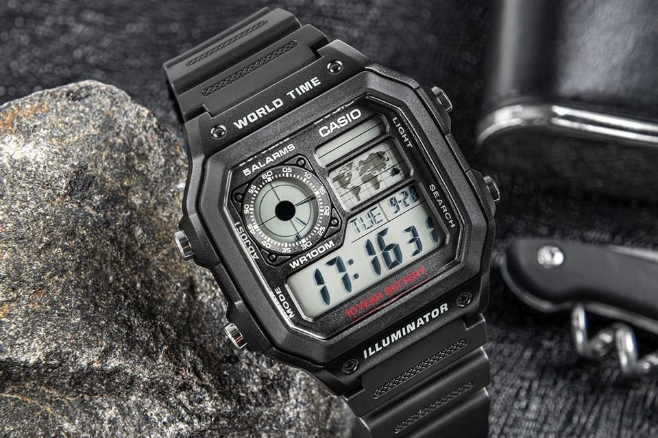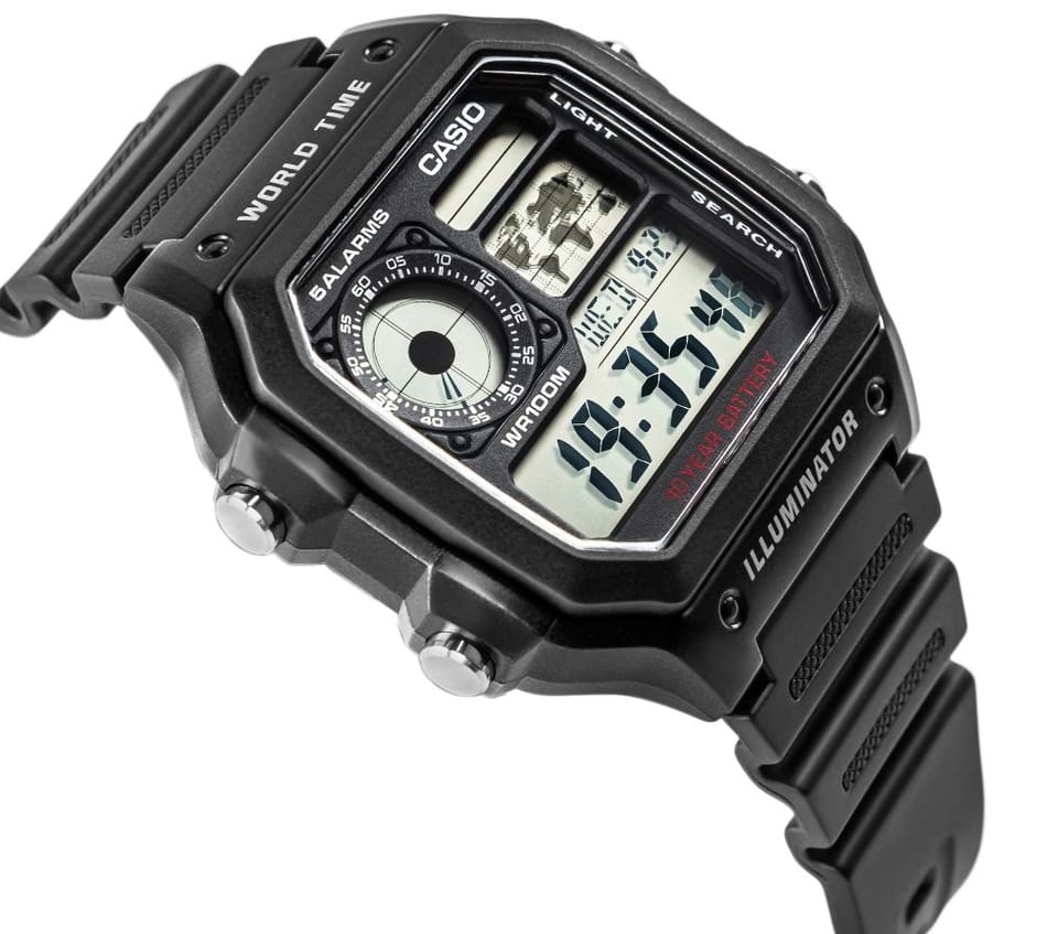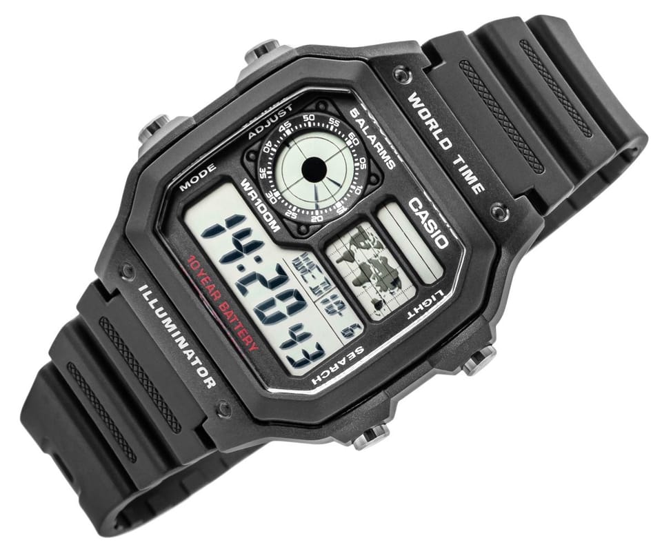 Casio AE-1200WH-1AVDF to wielofunkcyjny zegarek cyfrowy z wyświetlaczem LCD, zaprojektowany z myślą o osobach ceniących niezawodność, funkcjonalność i styl retro. Wyposażony jest w funkcję czasu światowego (World Time) z mapą świata i możliwością szybkiego przełączania między czterema zapisanymi strefami czasowymi, pięć niezależnych alarmów dziennych, sygnał pełnej godziny, stoper 1/100 sekundy działający do 24 godzin z funkcją międzyczasu (split time), timer odliczający od 1 sekundy do 24 godzin, automatyczny kalendarz uwzględniający lata przestępne, a także format wyświetlania 12/24 godziny. Dodatkowo posiada funkcję wyciszenia dźwięków przycisków, możliwość ustawienia czasu letniego (DST), podświetlenie LED z regulowanym czasem świecenia (1,5 lub 3 sekundy), tryb podwójnego czasu (Dual Time) oraz wskaźnik AM/PM. Zegarek jest zasilany baterią o żywotności do 10 lat, a jego wodoszczelność na poziomie 100 metrów (10 BAR) umożliwia bezpieczne użytkowanie podczas kontaktu z wodą i codziennych aktywności.