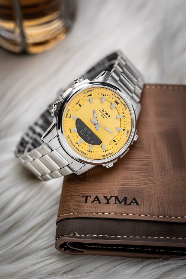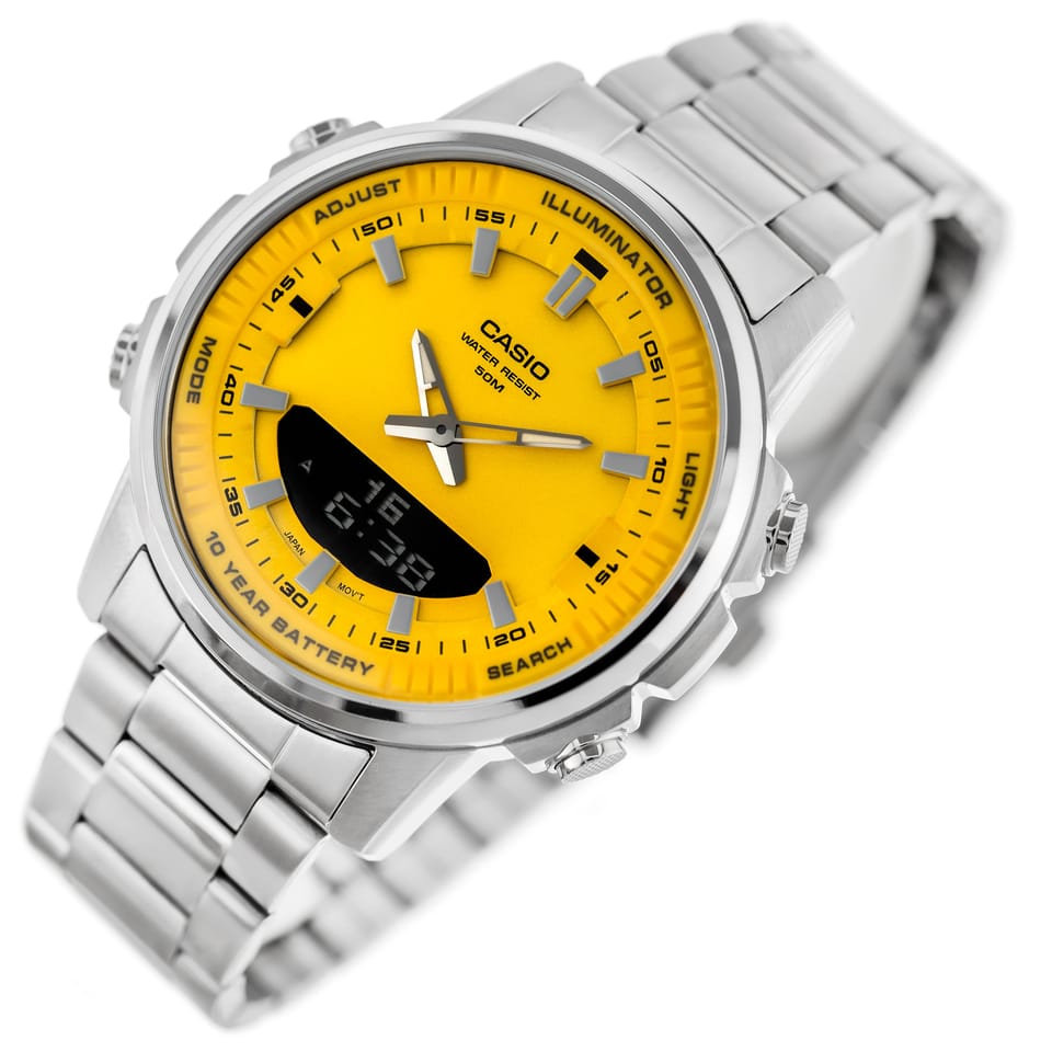 Zegarek męski CASIO AMW-880D-9A to połączenie elegancji, funkcjonalności i niezawodności w klasycznym stylu. Ten model zachwyca swoją uniwersalnością, idealnie sprawdzając się zarówno w codziennych sytuacjach, jak i podczas bardziej formalnych okazji. Jego okrągła, stalowa koperta w srebrnym odcieniu emanuje ciekawym designem, a jednocześnie zapewnia wytrzymałość na długie lata. Tarcza zegarka, utrzymana w żółtej kolorystyce, została ozdobiona wyraźnymi indeksami oraz wskazówkami pokrytymi luminescencyjną powłoką, co gwarantuje doskonałą czytelność nawet w warunkach słabego oświetlenia.