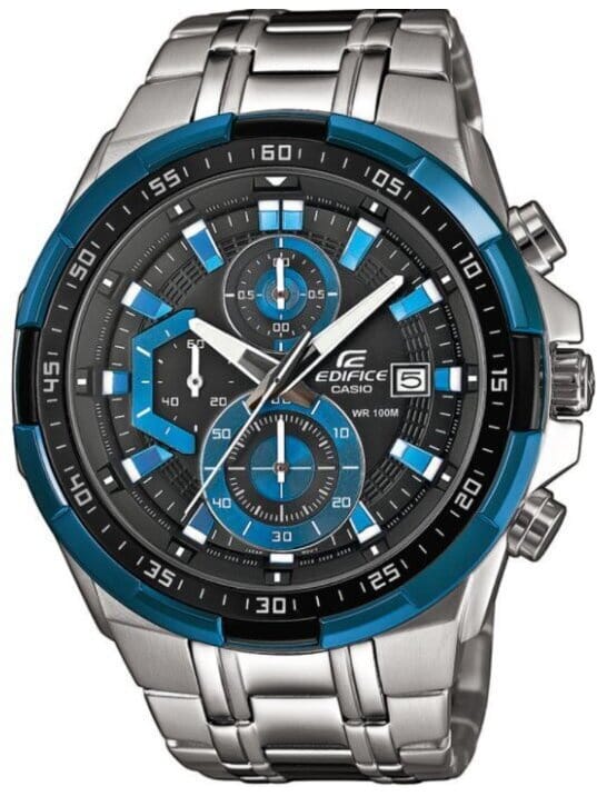 Zegarek Męski CASIO EDIFICE EF-539D-1AVUDF + BOXDuży, klasyczny chronograf wyposażony w solidną bransoletę. Trójwymiarowy pierścień oraz wyrazisty design tarczy, wzmocniony dynamicznym układem i kontrastowymi kolorami, nadają zegarkowi mocny, charakterystyczny wygląd. Wyposażony w funkcję daty dni miesiąca oraz chronografy: stoper sekund, minut oraz stoper 1/10s. Dzięki wodoszczelności 10 BAR możesz śmiało zabrać go na basen, trening czy wodną przygodę, a fluorescencyjne podświetlenie sprawia, że nawet po zmroku masz pełną kontrolę nad czasem.
