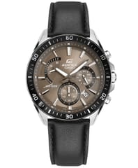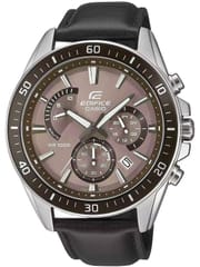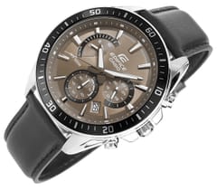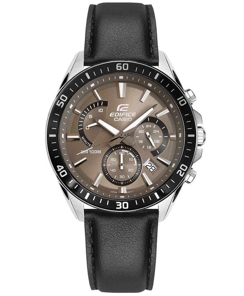 Podkreśl swój styl klasycznym chronografem EDIFICE z dużą kopertą i wyrazistym, a zarazem precyzyjnie dopracowanym designem. Czarny pasek z naturalnej skóry w połączeniu z jasnobrązową tarczą tworzy elegancki, a jednocześnie swobodny look z nutą wyrafinowania. Wyposażony w funkcję daty dni miesiąca oraz chronografy: stoper sekund, minut oraz chronograf 24h. Dzięki wodoszczelności 10 BAR możesz śmiało zabrać go na basen, trening czy wodną przygodę, a fluorescencyjne podświetlenie (wskazówki + indeksy) sprawia, że nawet po zmroku masz pełną kontrolę nad czasem.