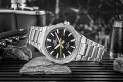Ten elegancki, trzywskazówkowy model analogowy wyróżnia się smukłą kopertą o grubości zaledwie 7,8 mm, zapewniającą doskonałe dopasowanie do nadgarstka. Zegarek posiada płaski, ośmiokątny bezel z wykończeniem w stylu szczotkowanej linii, który łączy sportowy charakter z luksusową estetyką. Podobne wykończenie zastosowano również na tarczy, nadając jej wysoką jakość i elegancję. Sportowy design podkreślają cztery widoczne śruby na rogach koperty, wyraziste indeksy oraz złota wskazówka sekundowa. Model wyposażono w odporne na zarysowania szkło szafirowe, zapewniające trwałość i doskonałą czytelność.