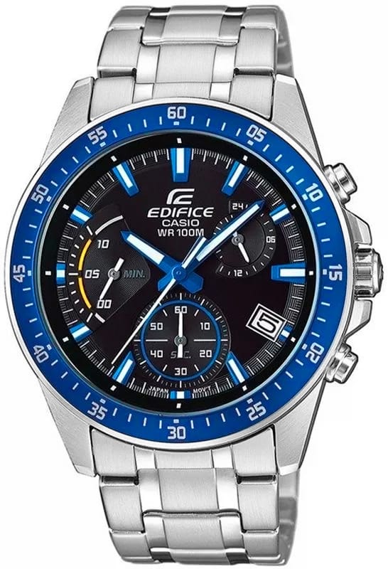 Średniej wielkości, standardowy chronograf EDIFICE z retrogradą umieszczoną na pozycji godziny 10. Sportowy charakter zegarka podkreślają niebieskie i żółte akcenty, które efektownie kontrastują z czarną tarczą. Wyposażony w funkcję daty dni miesiąca oraz chronografy: stoper sekund, minut oraz chronograf 24h. Dzięki wodoszczelności 10 BAR możesz śmiało zabrać go na basen, trening czy wodną przygodę, a fluorescencyjne podświetlenie sprawia, że nawet po zmroku masz pełną kontrolę nad czasem.