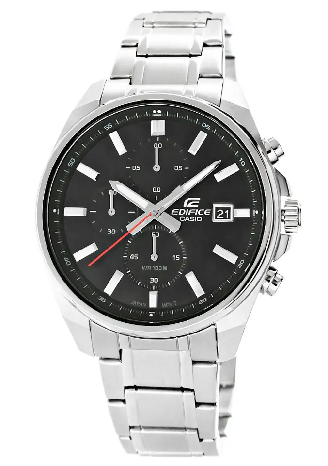 Zegarek Męski CASIO EDIFICE EFV-610D-1AVUEF + BOXŚredniej wielkości, klasyczny chronograf EDIFICE w nowoczesnym, sportowym wydaniu. Smukły bezel i szeroka, minimalistycznie zaprojektowana tarcza nadają dynamiczny charakter, a czerwony akcent na wskazówce sekundowej podkreśla sportowy temperament zegarka. Model wyposażony w funkcję daty dni miesiąca oraz chronografy: stoper 1/10 sekundy, minuty stopera oraz sekundy stopera. Dzięki wodoszczelności 10 BAR możesz śmiało zabrać go na basen, trening czy wodną przygodę, a fluorescencyjne podświetlenie sprawia, że nawet po zmroku masz pełną kontrolę nad czasem.
