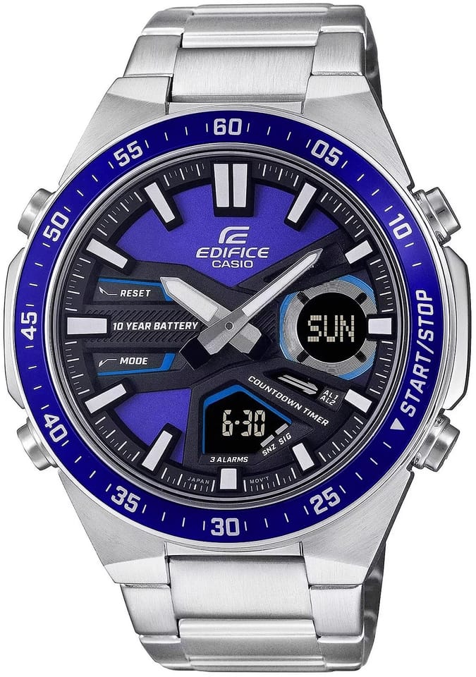 Wszechstronny zegarek dla aktywnych i wymagających. Analogowo-cyfrowy czasomierz EDIFICE EFV-C110 zapewnia precyzję i funkcjonalność na lata – 10-letnia bateria sprawia, że możesz zapomnieć o jej wymianie na długi czas. Dynamiczny, sportowy design podkreśla głębia i trójwymiarowość tarczy, a cyfrowe wyświetlacze oferują szeroki wachlarz funkcji, w tym czas światowy, stoper 1/100 sekundy i minutnik odliczający. Model posiada również Telememo z możliwością zapisania 30 numerów telefonów, zawierających do 12 cyfr z nazwą do 8 znaków. Skup się na życiu i wybierz EDIFICE EFV-C110 - zegarek, który Cię nie zawiedzie.