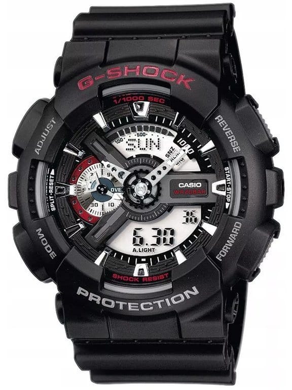 Funkcjonalność zegarka nie kończy się na jego wytrzymałości. Casio GA-110-1AER oferuje szeroką gamę przydatnych opcji – od stoperów, przez alarmy, po możliwość ustawienia drugiego czasu. Jego podświetlenie LED umożliwia komfortowe odczytanie godziny nawet w ciemnościach, a duży cyfrowo-analogowy wyświetlacz pozwala na łatwe śledzenie informacji. Zegarek jest także wodoodporny na poziomie 200 metrów, co czyni go doskonałym wyborem do aktywności nad wodą – zarówno pływania, jak i nurkowania.