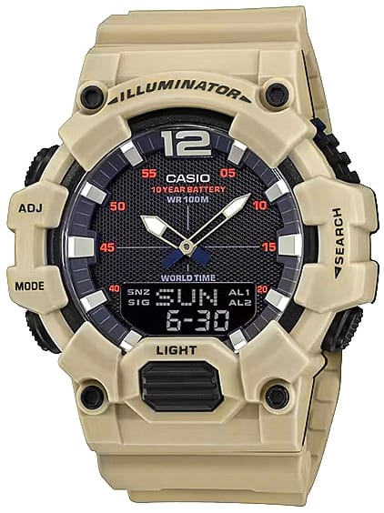 Postaw na wytrzymałość i styl survivalowy z Casio HDC-700-3A3VDF, zegarkiem stworzonym z myślą o mężczyznach gotowych na każde wyzwanie – od miejskiego zgiełku po ekstremalne wyprawy. Jego masywna, wielowarstwowa koperta w kolorze pustynnego beżu przyciąga wzrok i budzi respekt, a powiększona tarcza z wyraźnymi indeksami i cyfrowym wyświetlaczem gwarantuje błyskawiczny odczyt w każdych warunkach. Dzięki wodoszczelności do 100 metrów oraz wydajnej baterii działającej aż 10 lat, możesz mieć pewność, że ten zegarek Cię nie zawiedzie – nawet w deszczu, błocie czy na szlaku. Funkcje takie jak czas światowy, 3 alarmy, stoper, timer i Telememo (do 30 kontaktów) sprawiają, że masz wszystko pod ręką – bez konieczności sięgania po telefon, co jest nieocenione w terenie, podczas treningu czy podróży. To zegarek, który łączy outdoorowy charakter z miejską funkcjonalnością i daje Ci poczucie kontroli – niezależnie od miejsca i sytuacji.