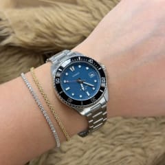 Solidna, stalowa konstrukcja zapewnia trwałość i pewność w każdej sytuacji, a charakterystyczny, obrotowy pierścień podkreśla jego nurkowe inspiracje oraz praktyczny charakter. Czytelne oznaczenia i wyraziste wskazówki sprawiają, że odczyt godziny jest szybki i intuicyjny, nawet w trudniejszych warunkach. Zegarek świetnie układa się na nadgarstku, oferując komfort noszenia przez cały dzień.