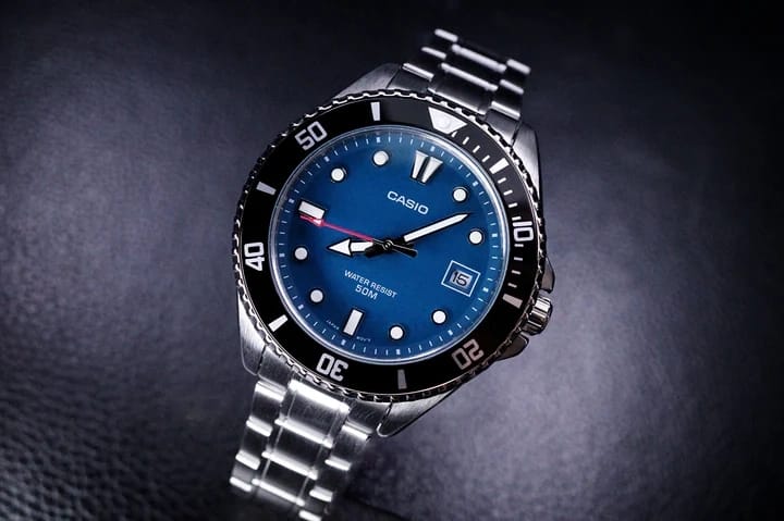CASIO MDV-10D-2A1 to zegarek stworzony z myślą o tych, którzy cenią połączenie sportowej funkcjonalności z wyrazistym, nowoczesnym stylem. Głęboka, niebieska tarcza przyciąga wzrok swoim dynamicznym charakterem i nawiązuje do świata wody oraz przygody, nadając całości świeżości i energii. To model, który doskonale odnajduje się zarówno w codziennym użytkowaniu, jak i podczas aktywnych wyzwań.