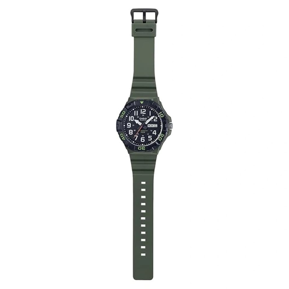 Zielons kolorystyka w połączeniu z wyrazistymi oznaczeniami godzin zapewnia świetną widoczność czasu w każdych warunkach. Wskazówki pokryte powłoką luminescencyjną ułatwiają odczyt w słabym oświetleniu. Lekka koperta oraz pasek z wytrzymałego tworzywa sztucznego gwarantują komfort noszenia nawet przez cały dzień. Wodoszczelność na poziomie WR100 sprawia, że zegarek nadaje się do pływania i codziennego kontaktu z wodą.