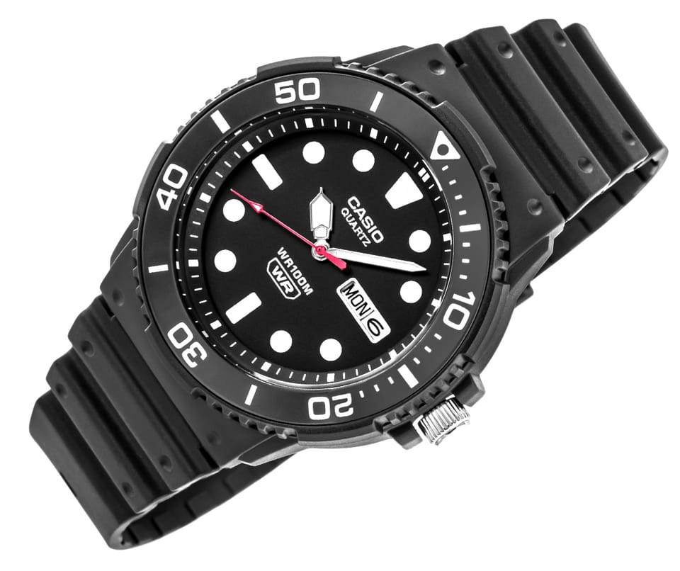 Casio MRW-230H-1E2VDF to solidny zegarek sportowy stworzony z myślą o aktywnych użytkownikach, którzy cenią niezawodność i praktyczne rozwiązania. Duża, czytelna tarcza z wyraźnymi indeksami oraz funkcją dnia tygodnia i daty zapewnia wygodę odczytu w każdej sytuacji, a mocna koperta i pasek z żywicy gwarantują trwałość i komfort noszenia. Wodoszczelność na poziomie 100 metrów pozwala swobodnie korzystać z zegarka podczas pływania i uprawiania sportów wodnych, a lekka konstrukcja sprawia, że zegarek pozostaje niemal niewyczuwalny na nadgarstku. To połączenie sportowego charakteru, nowoczesnego designu i funkcjonalności, które sprawdzi się zarówno na co dzień, jak i w czasie przygód na świeżym powietrzu.