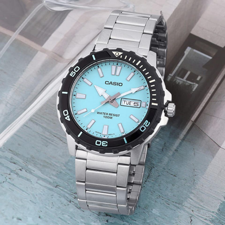 Zegarek męski Casio MTD-125D-2A3 to model, który łączy w sobie elegancję, solidność oraz sportowy charakter, idealnie pasujący do aktywnego trybu życia. Jego srebrna koperta z wysokiej jakości stali szlachetnej oraz wytrzymała bransoleta tworzą harmonijną całość, która sprawia, że zegarek nie tylko wygląda stylowo, ale również jest niezwykle trwały i odporny na codzienne użytkowanie. Cyferblat w intensywnym, niebieskim kolorze przyciąga wzrok, dodając temu modelowi wyrazistego charakteru, a jednocześnie pozostaje czytelny i elegancki.