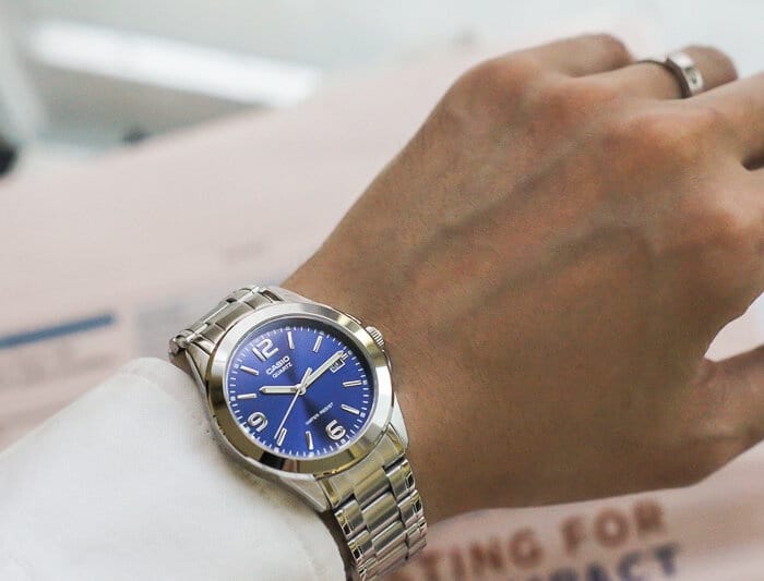 Zegarek Męski Casio MTP-1215A-2ADF to doskonały wybór dla mężczyzn, którzy cenią elegancję, funkcjonalność i niezawodność w jednym. Jego klasyczny design, połączony z nowoczesnymi rozwiązaniami, sprawia, że idealnie komponuje się zarówno z codziennymi stylizacjami, jak i bardziej formalnymi zestawami. Koperta zegarka wykonana z szlachetnej stali w kolorze srebrnym, która doskonale współgra z niebieską tarczą, nadając całości subtelnej elegancji. W centralnej części tarczy umieszczono wyraźne, srebrne wskazówki oraz indeksy, które zapewniają świetną czytelność, nawet w słabym świetle. Dodatkowo, na godzinie 3 znajduje się okno daty, które stanowi praktyczny element tego modelu.