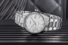Wykonana z wysokiej jakości stali nierdzewnej, o podwójnym rodzaju wykończenia: matowym środku oraz szczotkowanych brzegach nadaje zegarkowi unikalny wygląd. Stal nierdzewna jest materiałem odpornym na uszkodzenia mechaniczne, co sprawia, że bransoleta dobrze znosi codzienne użytkowanie i zachowuje swój estetyczny wygląd przez długi czas. Zegarek jest wyposażony w specjalne zapięcie typu "slide clasp", które pozwala na regulację długości bransolety bez potrzeby usuwania ogniw. Bransoleta posiada solidne, zatrzaskowe zapięcie, które zapobiega przypadkowemu rozpięciu zegarka, co jest szczególnie ważne w sytuacjach aktywnych lub intensywniejszych ruchach ręki.