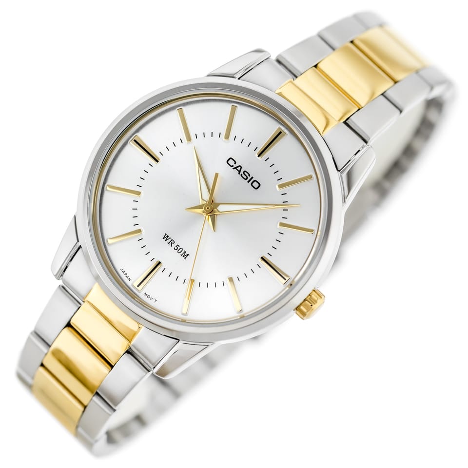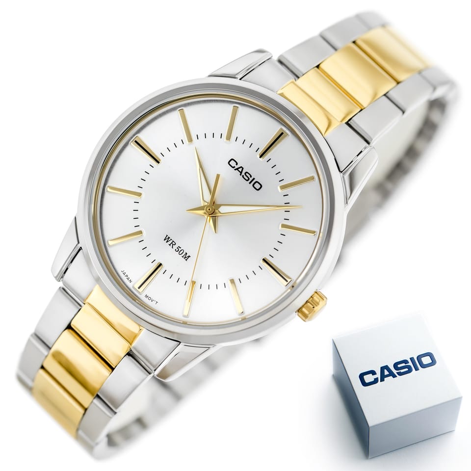 Casio MTP-1303SG-7A – elegancja, która nigdy nie wychodzi z mody.Klasyczny, ponadczasowy i niezawodny – taki właśnie jest Casio MTP-1303SG-7A. Jego elegancka tarcza w kolorze srebrnym, połączona z dwukolorową bransoletą ze stali nierdzewnej (srebro i złoto), sprawia, że zegarek doskonale prezentuje się zarówno do garnituru, jak i codziennego stroju.