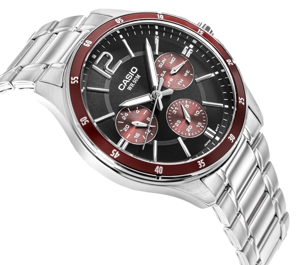 CASIO MTP-1374D-5AVDF to coś więcej niż zwykły zegarek – to niezawodny partner dla mężczyzny, który chce wyglądać stylowo w każdej sytuacji. Elegancka forma z nutą sportowego charakteru sprawia, że świetnie odnajduje się zarówno przy koszuli, jak i przy codziennym T-shircie. Czarna tarcza z srebrno czerwonymi akcentami przyciąga spojrzenia, a stalowa koperta i bransoleta z powłoką jonową (ion plated) zapewniają trwałość i odporność na zarysowania. Praktyczne subtarcze – dzień, data i czas 24-godzinny – pozwalają mieć wszystko pod kontrolą jednym rzutem oka. Dokładny mechanizm (±20 sekund/miesiąc) i wodoszczelność do 50 metrów sprawiają, że możesz go nosić bez obaw – w pracy, w podróży, nawet w deszczu. To klasyczny metalowy zegarek analogowy, który nie tylko wygląda dobrze, ale też działa wtedy, gdy go potrzebujesz.