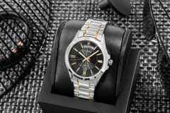Koperta zegarka wykonana jest z wysokiej jakości stali szlachetnej w kolorze srebrnym, co nadaje mu luksusowy wygląd, a jednocześnie zapewnia trwałość i odporność na uszkodzenia. Tarcza w odcieniach czerni z wyraźnymi indeksami oraz wskazówkami pozwala na łatwe odczytanie godziny w każdej sytuacji. Dodatkowo, metalowa bransoleta w kolorze srebrnym ze złotym pięknie komponuje się z całością, zapewniając wygodę noszenia i subtelną elegancję.