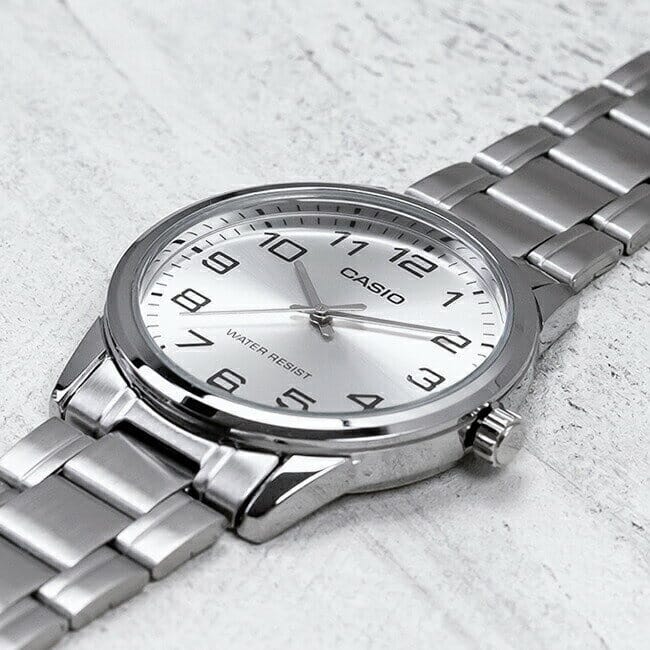 Zegarek Casio MTP-V001D-7BUDF to nie tylko świetny design, ale również solidność wykonania. Wodoodporność do 30M sprawia, że zegarek jest odporny na zachlapania, co zapewnia wygodę użytkowania na co dzień. Stalowa koperta jak i bransoleta są odporne na zarysowania.