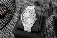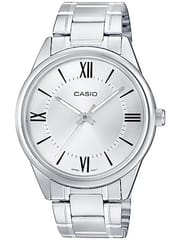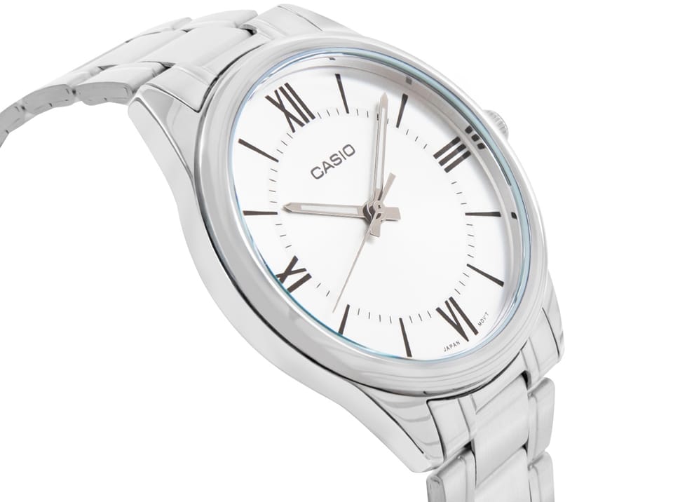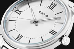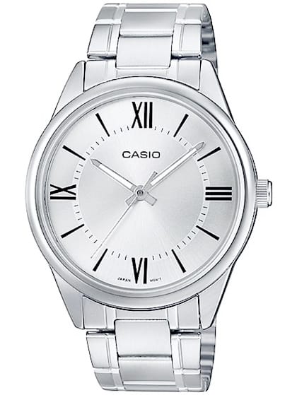 Wyróżnij się stylem zarówno w pracy, jak i podczas czasu wolnego dzięki linii eleganckich zegarków Casio MTP-V005. To Klasyczny zegarek analogowy CASIO zaprojektowany w oparciu o ponadczasowy wygląd wskazówek godzinowej, minutowej i sekundowej. Prosty, czytelny design tarczy sprawia, że łatwo jest być punktualnym. Zegarek wyróżnia się elegancką srebrną tarczą, która nadaje mu stylowy wygląd. Ciemne indeksy i delikatne wskazówki wyraźnie odcinają się na jasnym tle, zapewniając doskonałą czytelność. Srebrna koperta oraz elegancka bransoleta ze stali nierdzewnej tworzą spójną, stylową całość. Prosty design, wskazówki z fluorescencją i odporność na zachlapania sprawiają, że ten model CASIO to idealny wybór na co dzień.