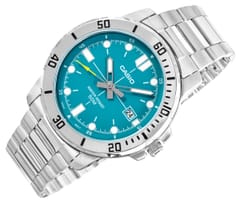 Zdecydowany i elegancki model CASIO przyciągający uwagę już od pierwszego spojrzenia. Stalowa koperta o średnicy 44 mm kryje turkusową tarczę, która natychmiast kojarzy się z energią, świeżością i swobodą. Kontrastowe, białe indeksy i masywne wskazówki zapewniają czytelność, a żółty grot sekundnika dodaje dynamicznego akcentu, który tchnie życie w każdą minutę. Wbudowany datownik przy godzinie trzeciej to praktyczny dodatek, który pomaga ogarnąć codzienny rytm, a wodoodporność 50M daje Ci pełną swobodę działania – niezależnie od pogody. Całość wieńczy stalowa bransoleta z potrójnym zapięciem, która łączy wytrzymałość z klasycznym stylem.