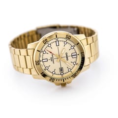 Tarcza zegarka utrzymana jest w złotej kolorystyce co dodaje jej głębi i wyjątkowego charakteru. Model ten posiada wyraźne wskazówki oraz indeksy, zapewniając doskonałą czytelność, a dodatkowy datownik na godzinie 3 zwiększa praktyczność tego modelu. Szkło mineralne chroniące tarczę jest odporne na zarysowania, co gwarantuje, że zegarek będzie prezentował się nienagannie przez długie lata.
