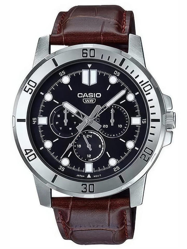 Wzbogacony o srebrne akcenty, model MTP-VD300L-1E zyskuje na wyjątkowym charakterze, będąc jednocześnie eleganckim dodatkiem do codziennych stylizacji, jak i tym, który będzie idealnie pasował do bardziej formalnych okazji. Srebrne indeksy i wskazówki, subtelnie wyróżniające się na tle ciemnej tarczy, nadają zegarkowi niepowtarzalny wygląd, który nigdy nie wyjdzie z mody.