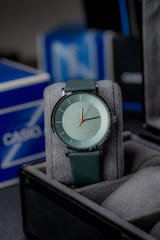 Tutaj nie ma miejsca na zbędne zdobienia – każdy element lekko wklęsłej tarczy (39 mm) został przemyślany z myślą o maksymalnej czytelności i harmonii. Tylko indeksy, trzy smukłe wskazówki i subtelne oznaczenie „Water Resist”. Wszystko zaprojektowane tak, by spojrzenie trwało sekundę, a odczyt godziny był natychmiastowy. Symetria, równowaga i klarowność.