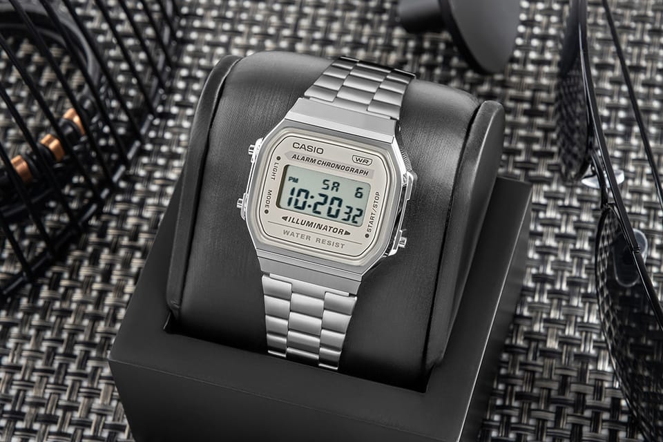 Ten zegarek to nie tylko odmierzacz czasu – to manifest stylu. CASIO w kolekcji Vintage wprowadza do współczesności klimat dawnych lat, kiedy design miał duszę, a prostota znaczyła klasę. Tarcza oprawiona w lekko połyskującą, chromowaną kopertę, budzi skojarzenia z industrialną elegancją – surową, ale szlachetną. Kwadratowy kształt i geometryczna czystość formy dodają mu charakteru – subtelnego, lecz wyrazistego. Dzięki kompaktowym wymiarom i lekkiej budowie (zaledwie 50 g), niemal stapia się z nadgarstkiem, dając poczucie naturalnego komfortu. Model posiada standardowe wskazanie czasu (cyfrowe): godzina, minuta, sekunda, oznaczenie pory dnia (PM), data, dzień tygodnia. A gdy przychodzi moment działania – ma wszystko, czego trzeba. Stoper 1/100 sekundy, funkcja międzyczasów, codzienny alarm i sygnał godzinowy – praktyczne narzędzia w zgrabnym wydaniu. Wieczorem, gdy światło przygasa, wystarczy jedno naciśnięcie – elektroluminescencyjne podświetlenie w odcieniu niebieskozielonym rozjaśni tarczę i nada jej niepowtarzalnego klimatu.