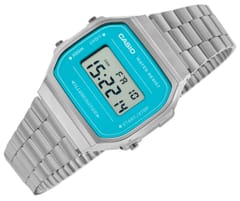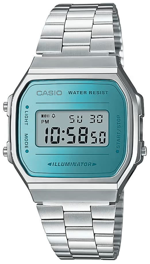 Nie każdy zegarek potrafi połączyć klasykę z charakterem, ale ten robi to bez wysiłku. Casio A168WEM-2EF to powrót do korzeni w najlepszym wydaniu – prosty, czytelny, z lustrzaną tarczą w turkusowym odcieniu, która przyciąga spojrzenia, ale nie robi z tego show. Chromowana koperta i dopasowana stalowa bransoleta tworzą spójną całość – surową, elegancką, bez przesady. Ten zegarek nie potrzebuje trendów. On już dawno wyznaczył własne. Model posiada standardowe wskazanie czasu (cyfrowe): godzina, minuta, sekunda, oznaczenie pory dnia (PM), data, dzień tygodnia. A gdy przychodzi moment działania – ma wszystko, czego trzeba. Stoper 1/100 sekundy, funkcja międzyczasów, codzienny alarm i sygnał godzinowy – praktyczne narzędzia w zgrabnym wydaniu. Wieczorem, gdy światło przygasa, wystarczy jedno naciśnięcie – elektroluminescencyjne podświetlenie w odcieniu niebieskozielonym rozjaśni tarczę i nada jej niepowtarzalnego klimatu. Model posiada również odporność na zachlapania – bo życie nie pyta, czy masz parasol.