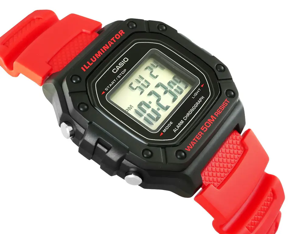 Zegarek Męski Casio W-218H-4B to ponadczasowy klasyk, który doskonale sprawdzi się u każdego mężczyzny, łącząc w sobie prostotę, funkcjonalność i sportowy design. Ten model to hołd dla kultowych czasomierzy lat 80., które do dziś zachwycają swoją ciekawą formą i niezawodnością. Jego prostokątna, czarna tarcza z wyraźnym wyświetlaczem zachowuje czytelność w każdych warunkach, a subtelny datownik dodaje mu praktycznego charakteru. Lekka koperta z wytrzymałego tworzywa w połączeniu z elastycznym paskiem w kolorze czerwonym sprawia, że zegarek jest nie tylko stylowy, ale także niezwykle wygodny w codziennym noszeniu.