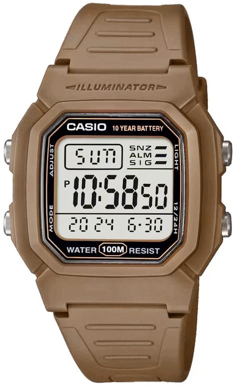 Zegarek Męski Casio W-800H to niezawodność w czytelniej formie - nowoczesny zegarek cyfrowy z dużym wyświetlaczem, który umożliwia szybki i łatwy odczyt godziny. Wyposażony w wodoszczelność do 100 metrów, baterię o żywotności 10 lat, podświetlenie LED oraz inne funkcje. Zegarek oferuje wszystkie najważniejsze informacje - godzina, data i dzień tygodnia - w dużej czytelnej formie. Dzięki funkcjom takim jak stoper 1/100 sekundy, podwójny czas i alarm z drzemką, świetnie sprawdza się zarówno podczas treningów, jak i w podróży. Wytrzymałe podświetlenie LED z efektem poświaty zapewnia dobrą widoczność nawet po zmroku. Solidna konstrukcja zapewnia trwałość w miejskiej dżungli i podczas outdoorowych przygód.