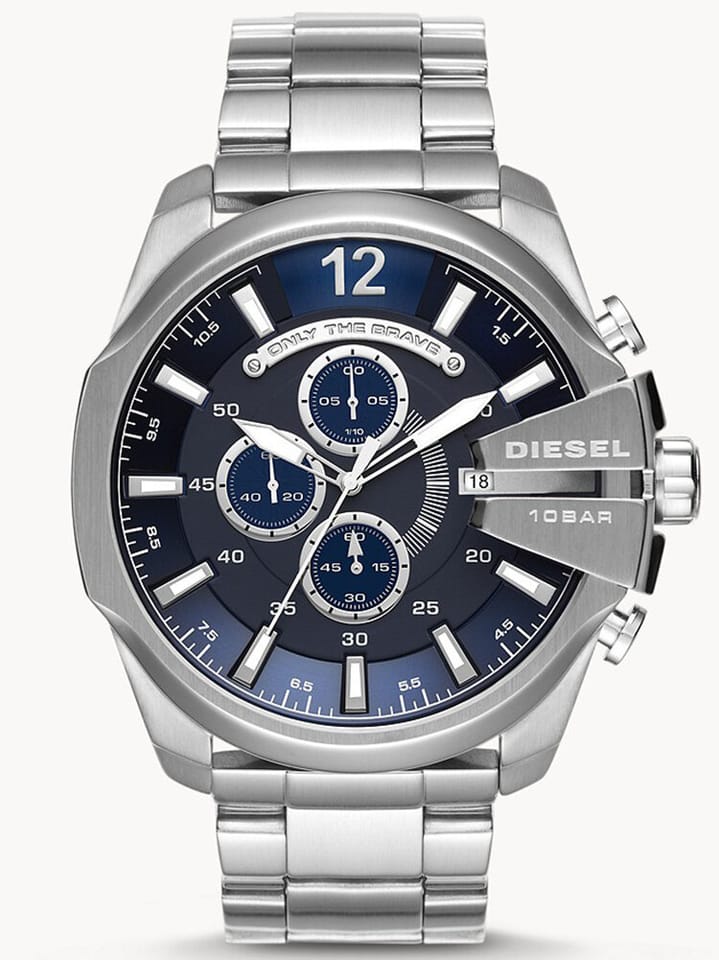 Zegarek męski Diesel Mega Chief DZ4417 napędza japoński mechanizm kwarcowy, zasilany baterią o średniej żywotności 2 lat. Niebieski cyferblat czasomierza, zabezpiecza bardzo odporne na zarysowania szkiełko mineralnym. Kopertę i bransoletę wykonano ze stali szlachetnej, co gwarantuje wieloletnią trwałość.