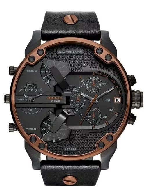 Zegarek męski Diesel Mr. Daddy 2.0 DZ7400 to duży męski zegarek. Czarny skórzany pasek doskonale komponuje się z dwu kolorową kopertą, którą wykonano z hipoalergicznej stali szlachetnej. Na tarczy zamontowano 4 oddzielne mechanizmy mierzenia czasu. Całość pokryta szkłem mineralnym gwarantuje wytrzymałość na zarysowania i pęknięcia. Wodoodporność na 30 metrów chroni przed zachlapaniem. Zastosowany mechanizm kwarcowy jest niezawodny. Model Diesel Mr. Daddy 2.0 DZ7400 to połączenie niewymuszonej elegancji ze sportowym charakterem - musi przyciągać uwagę!