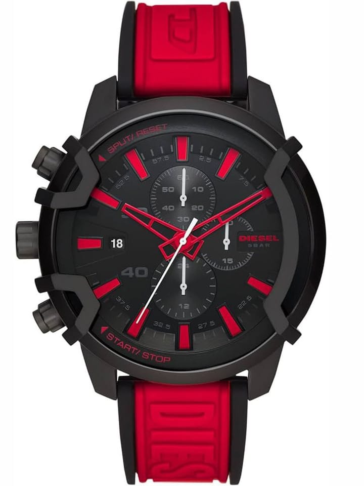 Zegarek Diesel Griffed Chronograph DZ4530 to wybór dla mężczyzn, którzy cenią sobie wyraziste akcenty w czerwonym kolorze. Jego sportowa konstrukcja obejmuje okrągłą kopertę ze stali nierdzewnej odpornej na korozję oraz silikonowy pasek w kolorze czerwonym i czarnym. Model ten posiada analogowy cyferblat chroniony szkiełkiem mineralnym. Na tarczy znajdziesz datownik oraz subtarcze dla chronografu. Koronka i przyciski do obsługi funkcji komplikacji znajdują się po lewej stronie koperty. Z wodoodpornością na poziomie 50 metrów zegarek jest odporny na zachlapania, co zapewnia ochronę mechanizmu kwarcowego.