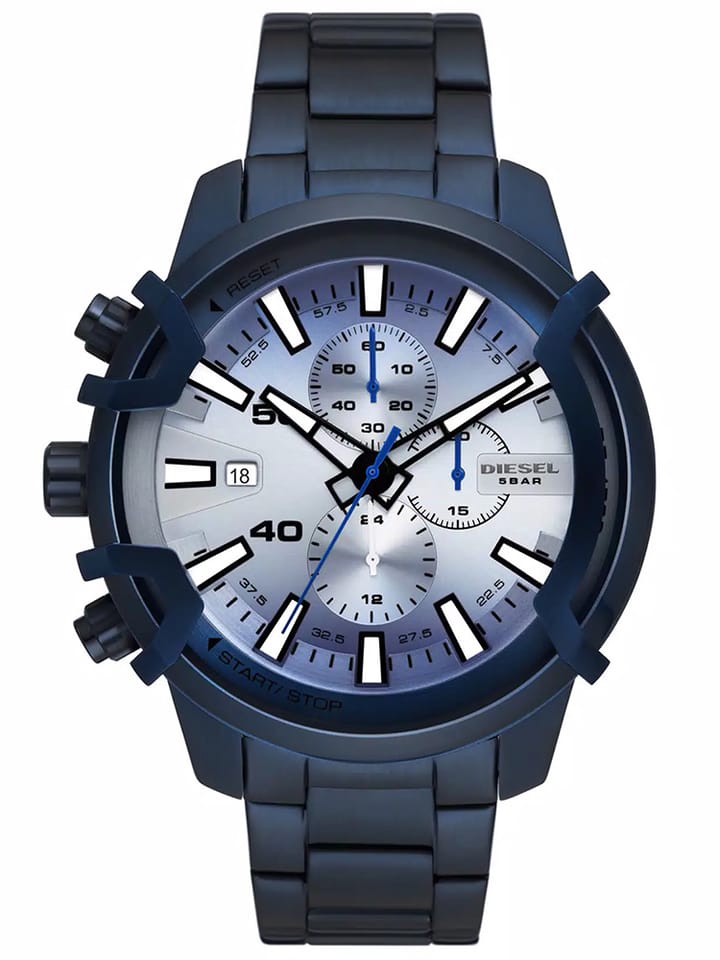 Zegarek Diesel Griffed DZ4596 to wybór dla mężczyzn, którzy cenią sobie wyraziste akcenty w niebieskim kolorze. Jego elegancka konstrukcja obejmuje okrągłą kopertę oraz bransoletę ze stali nierdzewnej, odpornej na korozję, a także analogowy cyferblat chroniony szkiełkiem mineralnym. Na tarczy znajdziesz datownik oraz subtarcze dla chronografu. Koronka i przyciski do obsługi funkcji komplikacji znajdują się po lewej stronie koperty. Z wodoodpornością na poziomie 50 metrów zegarek jest odporny na zachlapania, co zapewnia ochronę mechanizmu kwarcowego.