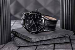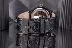 Czarny pasek z teksturowaną powierzchnią nie tylko wygląda, ale też daje uczucie surowej mocy na nadgarstku. Jego struktura to coś, co poczujesz pod palcami – męska surowość i solidność, które dodają zegarkowi charakteru. Wykonany jest z wysokiej jakości, naturalnej skóry, która jest miękka w dotyku, jakby stworzona po to, by idealnie przylegać do Twojej skóry. Dobrze dopasowana klamra doskonale układa się na nadgarstku, zapewniając wygodę noszenia przez cały dzień. To nie tylko komfort – to poczucie, że masz na sobie coś wyjątkowego, co działa na zmysł dotyku.