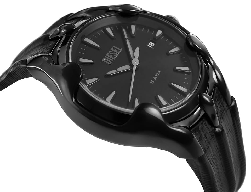 Czarna, matowa tarcza to minimalistyczne tło, które wydaje się pochłaniać światło, tworząc przestrzeń idealną do wyeksponowania detali. Każde spojrzenie na nią przypomina o mocy ciemności, a jednocześnie nie ma tu miejsca na zbędny błysk. Tarcza jest spokojna, skupiona – jak Ty w momencie podejmowania ważnych decyzji. Na tej ciemnej powierzchni wyróżnia się srebrne logo Diesel, jak ukryta siła, gotowa do działania. Ten delikatny błysk przykuwa uwagę i dodaje zegarkowi eleganckiego charakteru. Indeksy oraz wskazówki w odcieniach czerni i szarości wtapiają się w tarczę, tworząc wrażenie jednolitej, głębokiej powierzchni. To nie są barwy, które się wybijają – są tu, aby przypominać, że detale mogą decydować o wygranej. Sekundnik w kolorze szarym, jak cień, delikatnie odmierza czas, bez pośpiechu, ale z nieustępliwością. To minimalistyczny akcent, który wzmacnia poczucie harmonii.