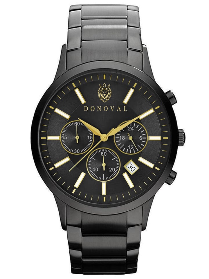 Zegarek na rękę Donoval Chronostar DL0026 to elegancki, klasyczny męski czasomierz - idealny na co dzień, jak i na specjalne okazje. Koperta oraz bransoletę wykonano ze stali nierdzewnej z wysokiej jakości powłoką w kolorze czarnym - zapewnia to wieloletnia trwałość. Na tarczy w kolorze czarnym zabezpieczonej szkłem mineralnym znajdziemy datownik dnia miesiąca, subtarcze będące wskazaniami chronografu oraz wyznaczniki godzin w kolorach białym i złotym. Zegarek napędza kwarcowy mechanizm Miyota.