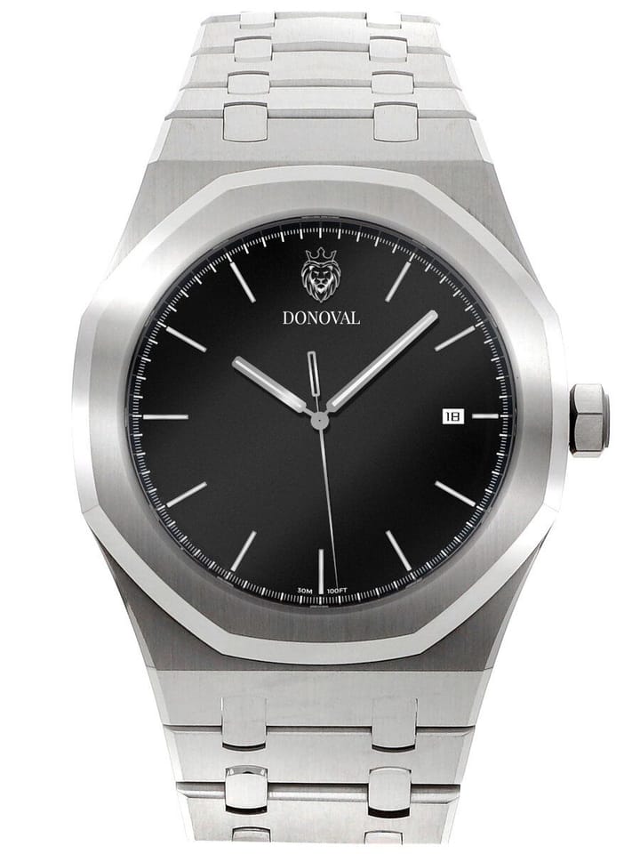 Zegarek na rękę Donoval Otto DL0007 to stylowy męski czasomierz - idealny na co dzień, jak i na specjalne okazje. Koperta wykonana jest ze stali nierdzewnej i ma średnicę 41 mm, również bransoleta wykonana jest ze stali nierdzewnej. Na tarczy w kolorze czarnym zabezpieczonej szkłem mineralnym znajdziemy datownik dnia miesiąca oraz wyznaczniki godzin w kolorze srebrnym. Zegarek napędza kwarcowy mechanizm Miyota.