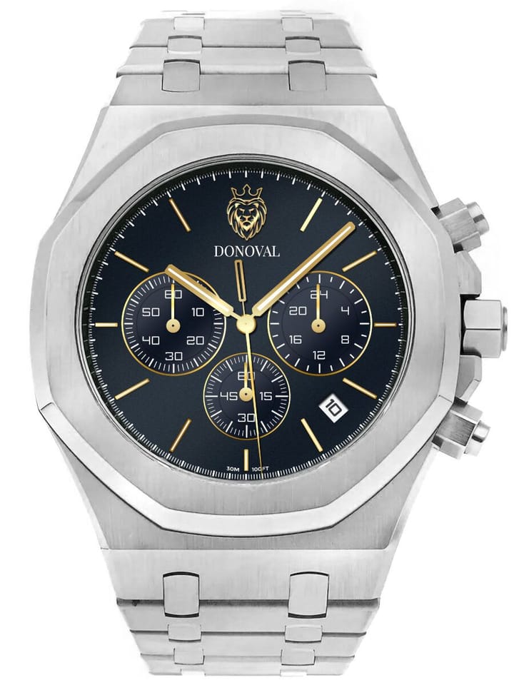 Zegarek na rękę Donoval Otto DL0015 to stylowy męski czasomierz - idealny na co dzień, jak i na specjalne okazje. Koperta wykonana jest ze stali nierdzewnej i ma średnicę 41 mm, również bransoleta wykonana jest ze stali nierdzewnej. Na tarczy w kolorze czarnym zabezpieczonej szkłem mineralnym znajdziemy datownik dnia miesiąca, subtarcze będące wskazaniami chronografu oraz wyznaczniki godzin w kolorze złotym. Zegarek napędza kwarcowy mechanizm Miyota.