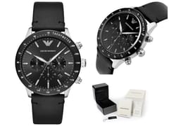 Zegarek Emporio Armani AR11243 Mario to męski czasomierz, idealny zarówno do eleganckiego ubioru, jak i do noszenia na co dzień. Na tarczy zabezpieczonej mineralnym szkłem znajdziemy datownik wskazujący dzień miesiąca oraz subtarcze będące wskazaniami chronografu i czasu dobowego.