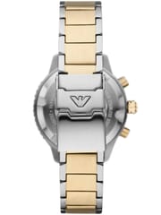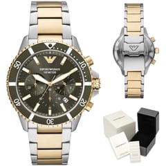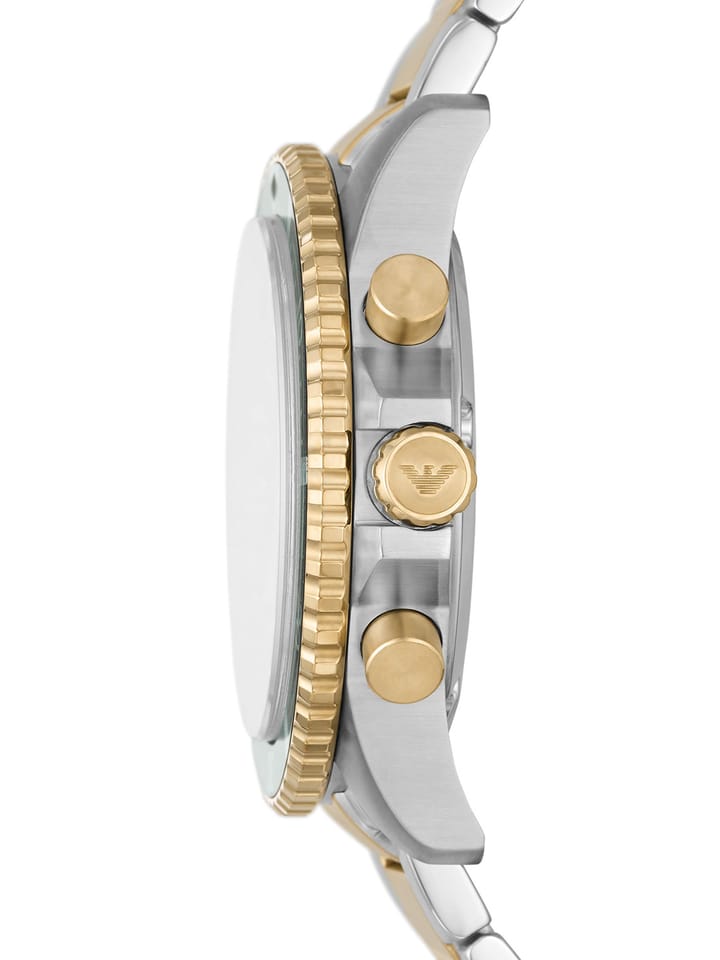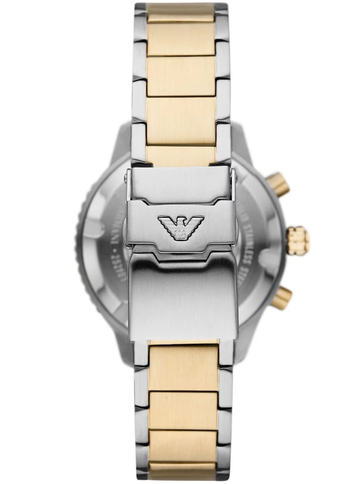 Męski zegarek Emporio Armani AR11361 Diver to elegancki męski zegarek, który został przygotowany z myślą o wszystkich miłośnikach mody i najnowszych stylistycznych trendów. Bransoleta oraz koperta wykonane zostały ze stali szlachetnej, część elementów okrywa powłoka PVD w odcieniu złotym. Ten model zegarka czaruje unikatowym, bardzo charakterystycznym designem ponieważ każdy z elementów jest tu przemyślany i ściśle związany z aspektem funkcjonalnym. Jeśli szukasz zegarka na długie lata, to model ten będzie strzałem w dziesiątkę.Na grafitowej tarczy zabezpieczonej mineralnym szkłem znajdziemy datownik wskazujący dzień miesiąca oraz subtarcze będące wskazaniami chronografu oraz czasu dobowego.