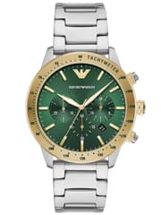 Zegarek Emporio Armani AR11454 Mario to męski czasomierz, idealny zarówno do eleganckiego ubioru, jak i na co dzień. Na ciemnozielonej tarczy zabezpieczonej mineralnym szkłem znajdziemy datownik wskazujący dzień miesiąca oraz subtarcze będące wskazaniami chronografu i czasu dobowego oraz stylowe wyznaczniki godzin w odcieniu różowego złota.
