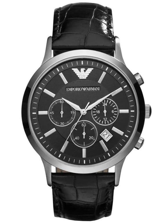 Męski zegarek Emporio Armani AR2447 z serii Renato to klasyczny męski zegarek na każdą okazję. Kopertę wykonano ze stali szlachetnej, a pasek z wysokiej jakości skóry. Na czarnej tarczy zabezpieczonej mineralnym szkłem znajdziemy datownik dnia miesiąca oraz subtarcze będące wskazaniami chronografu oraz czasu dobowego.