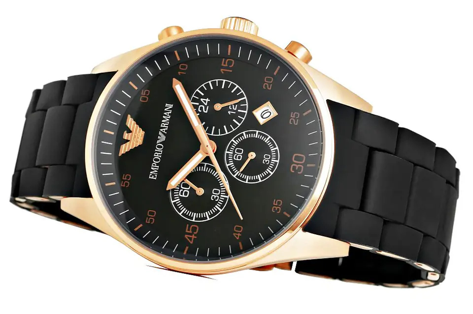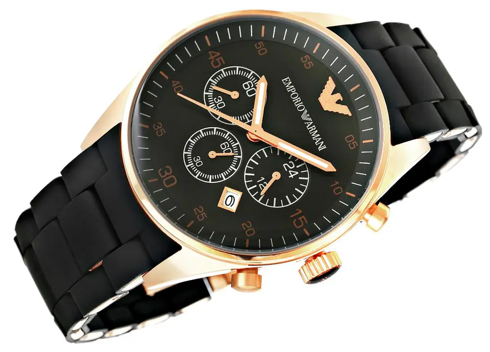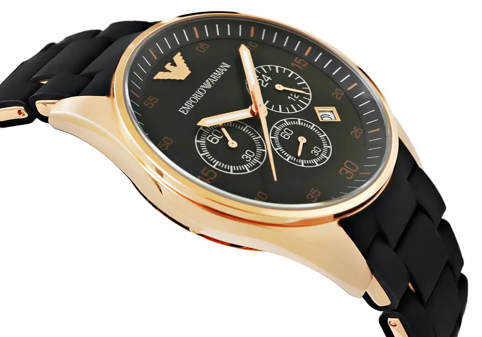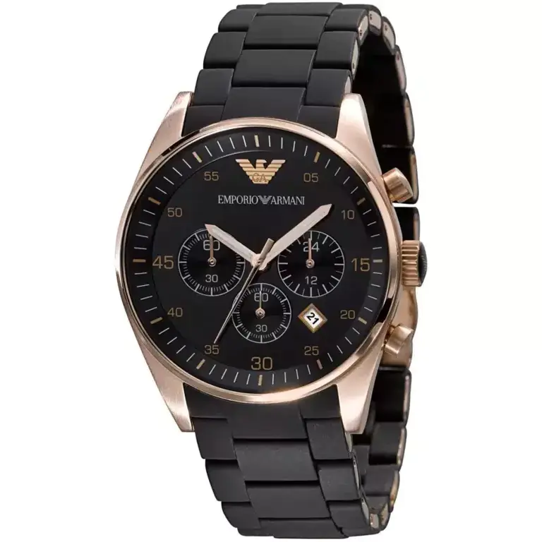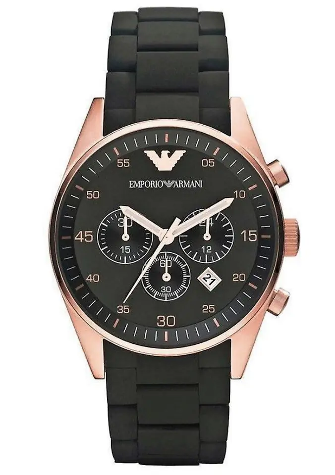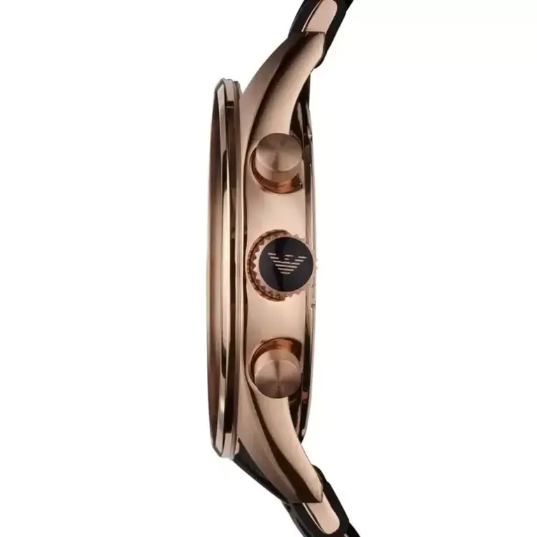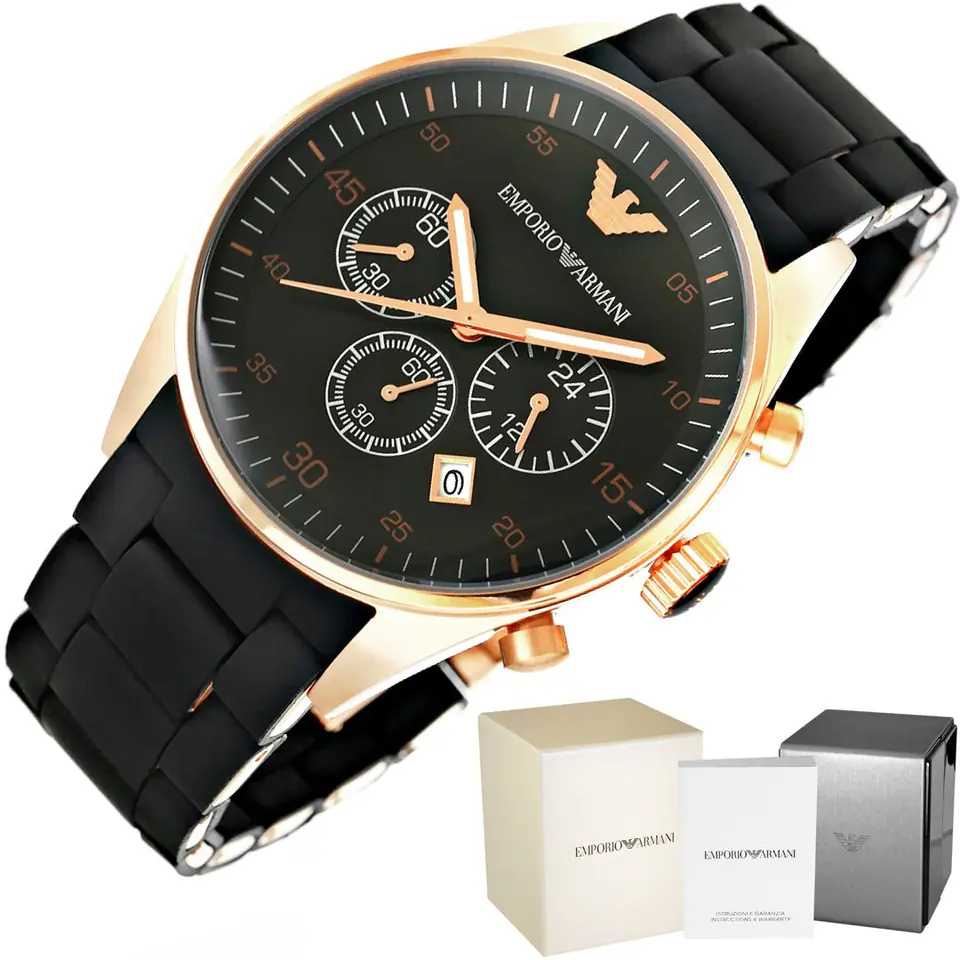 Męski zegarek od włoskiego producenta Emporio Armani, łączący w sobie stylową klasykę i sportową elegancję. Stanowi wysublimowany dodatek, który dopełni każdą stylizację. Koperta czasomierza wykonana jest ze stali szlachetnej, czarna tarcza chroniona jest przez szkiełko mineralne, zapewniające odporność na zarysowania. Dodatkowymi atutami zegarka są fosforyzujące wskazówki, precyzyjny mechanizm kwarcowy, chronograf i datownik, oraz odporność na delikatne zachlapania
