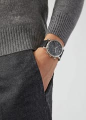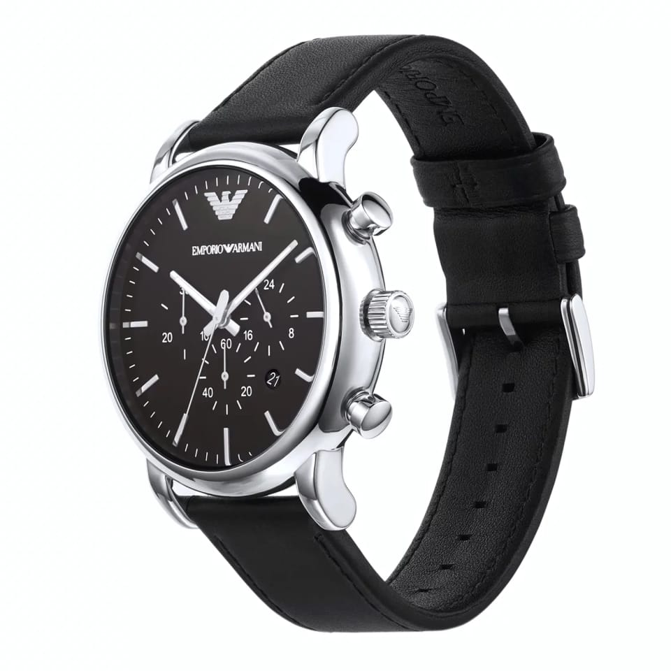 Zegarek Emporio Armani Luigi AR1828 to męski czasomierz, idealny zarówno do eleganckiego ubioru, jak i do noszenia na co dzień. Kopertę wykonano ze stali szlachetnej, co gwarantuje jej wieloletnią odporność na zniszczenie. Na tarczy w kolorze czarnym zabezpieczonej szkłem mineralnym znajdziemy datownik dnia miesiąca oraz wskazania chronografu i czasu dobowego. Całości dopełnia wysokiej jakości skórzany pasek w kolorze czarnym.