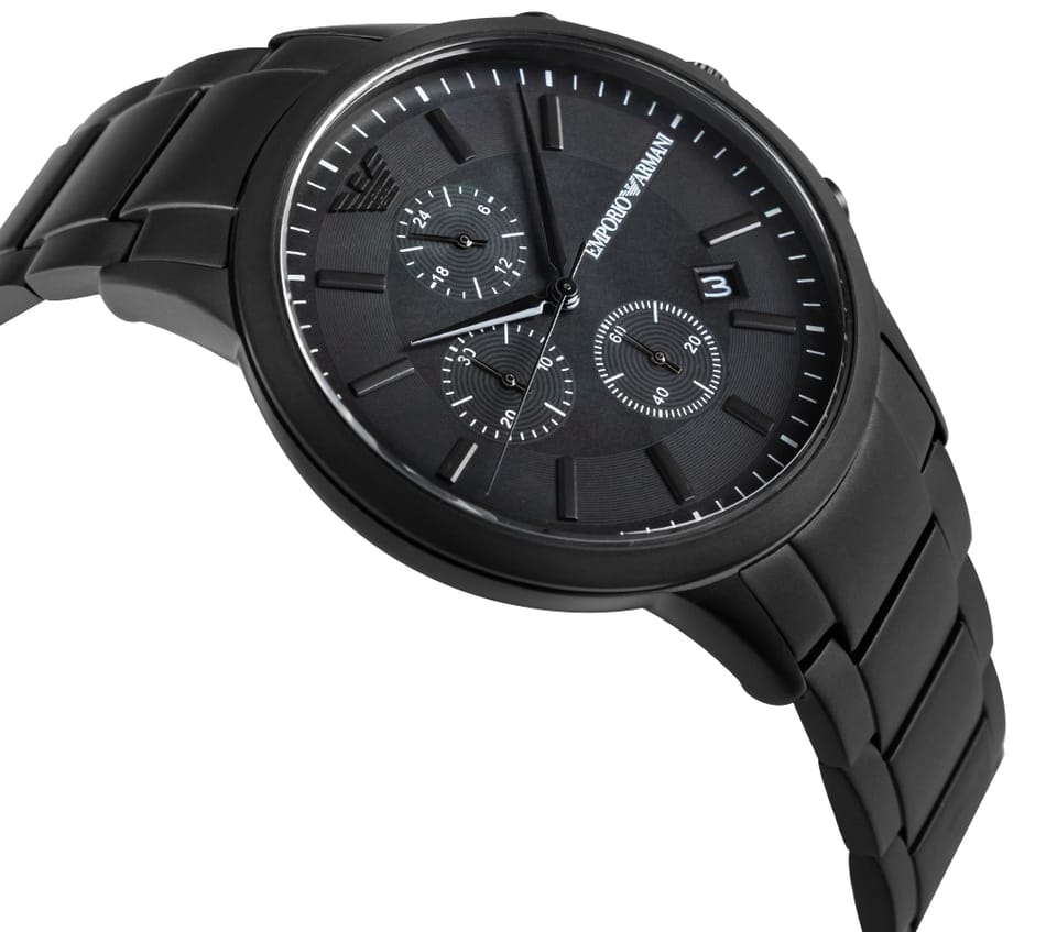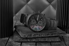 Zegarek męski Emporio Armani Renato AR11275 to elegancki czasomierz, który łączy klasyczny styl z nowoczesnym designem charakterystycznym dla marki Armani. Koperta o średnicy około 43 mm wykonana jest ze stali szlachetnej w kolorze czarnym, co nadaje zegarkowi trwałości i ponadczasowego wyglądu. Czarna matowa bransoleta ze stali szlachetnej doskonale komponuje się z czarno perłowym cyferblatem, na którym znajdują się minimalistyczne indeksy godzinowe oraz logo Emporio Armani umieszczone na godzinie 12. Zegarek wyposażony jest w precyzyjny mechanizm kwarcowy, zapewniający dokładne odmierzanie czasu. Szkiełko mineralne chroni tarczę przed zarysowaniami, a wodoszczelność na poziomie 5 ATM pozwala na bezpieczne użytkowanie zegarka podczas codziennych czynności. Model Emporio Armani Renato AR11275 to doskonały wybór dla mężczyzn ceniących klasykę, elegancję i jakość wykonania, idealny zarówno do garnituru, jak i do casualowych stylizacji.