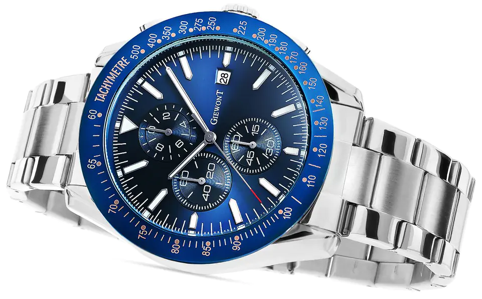 Zegarek męski Giewont GW8620-2 wyposażony jest w chronografy sekund stopera, minut stopera, trybu czasu 24-godzinnego oraz datownik dni miesiąca.