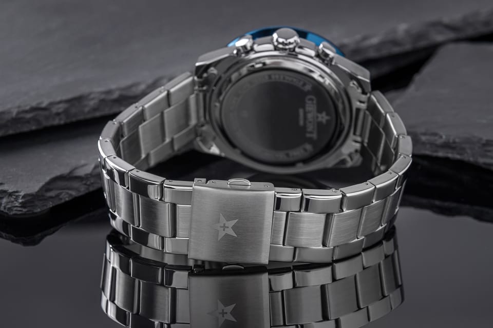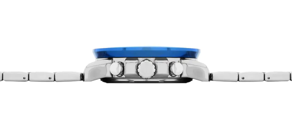 Tarcza: Analogowa z chronografami sekund stopera, minut stopera, trybu czasu 24-godzinnego oraz datownik dni miesiąca