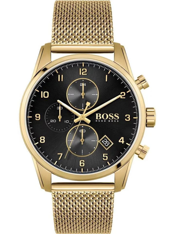 Zegarek męski Hugo Boss 1513838 Skymaster to elegancki męski zegarek idealny zarówno do eleganckiego ubioru, jak i do noszenia na co dzień. Na czarnej tarczy zabezpieczonej mineralnym szkłem i otoczonej złotym pierścieniem znajdziemy datownik dnia miesiąca oraz subtarcze będące wskazaniami chronografu i czasu dobowego.